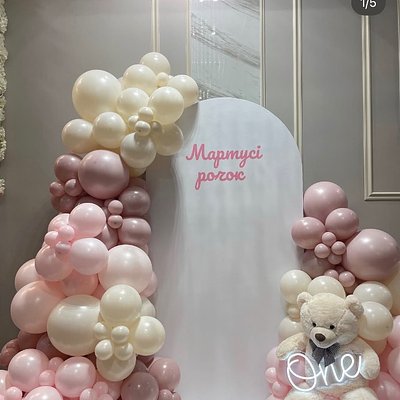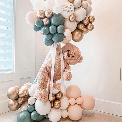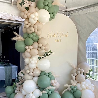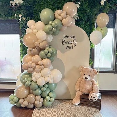 6.5 Wood Arch Backdrop (1 qty) “We can Bearly Wait” in brown Organic Balloon Garland (1 qty) Sage green, cream, and white Indoors or Outdoors?